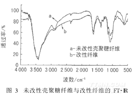 采用傅里葉紅外光譜,分析以3-縮水甘油氧丙基三甲氧基硅烷(KH560)作交聯劑制備的納米SiO2改性殼聚糖纖維中的殼聚糖纖維與KH560是否發生反應,結果見圖3。