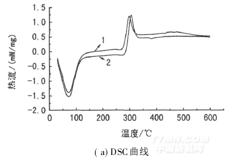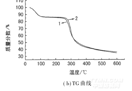 從圖4可看出,在相同條件下,未改性殼聚糖纖維的熱失重從112. 7℃就已開始, 264. 1℃已產生明顯的熱分解,當溫度升到300℃左右,質量損失急速增加,質量損失率約為49. 98%; 237. 1~458. 1℃為主要的裂解階段—殼聚糖纖維鏈裂解反應。與此相比,改性纖維的熱失重從118. 3℃開始, 286. 8℃迅速下降。286. 8~451. 1℃為主要的裂解階段,質量損失增加最大,此階段質量損失率約為48. 2%。比較圖4(a)和(b)可知,未改性殼聚糖纖維的初始失重溫度和最大熱失重速率溫度均比改性纖維要低,表明改性纖維的熱降解滯后于未改性殼聚糖纖維。這是因為硅偶聯劑、納米SiO2與殼聚糖纖維之間交聯網絡阻止了殼聚糖分子鏈的運動,要使殼聚糖纖維分子鏈在加熱過程中斷裂則需要較高的溫度。這也說明殼聚糖纖維聚合物鏈對SiO2納米顆粒的包覆作用主要是通過共價鍵,而不是氫鍵。正是由于這種包覆作用,改性纖維的熱穩定性較未改性殼聚糖纖維有較明顯提高。
