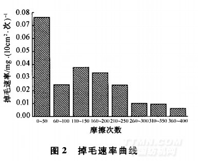 兔毛織物在日常服用過程中,與周圍的其他物體不斷發(fā)生摩擦,這種摩擦力使兔毛易于斷裂或者 滑出紗線和織物的表面而形成掉毛,但是由于這種 作用比較柔和,所以發(fā)生掉毛的是那些斷裂強力和 抽拔力較小的兔毛,它直接影響兔毛掉毛量。通過線性擬合方法分別獲得掉毛曲線中磨擦10~50、 60~100、110~150、160~200 210~250 260~300 300~350、360~400次各階段的斜率,以獲得的斜 率為Y軸,磨擦次數(shù)為x軸,得到掉毛速率直方圖, 結(jié)果如圖2所示。 由圖2可看出,在初始階段掉毛量增加很快,這 是因為摩擦因數(shù)小,強力低的兔毛提前滑脫與斷裂 并迅速從織物上掉落。但隨著摩擦次數(shù)的增加,織 物的掉毛速率成波動性變化,這一方面說明織物上 的兔毛纖維的斷裂強力、抽拔力差別較大,另一方面 也說明織物上兔毛纖維規(guī)格具有鮮明的特點,相近規(guī)格的兔毛纖維從織物上掉落所需要的外界條件也 要相近。分析圖2可以得到以下結(jié)論:當(dāng)織物平磨 接近50次時,掉毛速率達到第一個波谷,此時,斷裂 強力較小、抽拔力較弱的兔毛纖維已經(jīng)從織物上掉 落;之后掉毛速率在波動中逐漸降低,當(dāng)織物平磨 300次左右,織物的掉毛速率已經(jīng)很小了,此時,已 經(jīng)基本達到模擬日常穿著過程,兔毛纖維的掉毛量 基本不再增加。