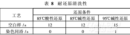 選用85℃酸性或堿性在還原清洗,水滴瞬間滲透;若堿性條件、95℃還原清洗,親水性略有下降(表8)。因此,建議選用酸性還原清洗。若采用堿性還原清洗,清洗溫度不宜>85℃,并控制堿的用量。
