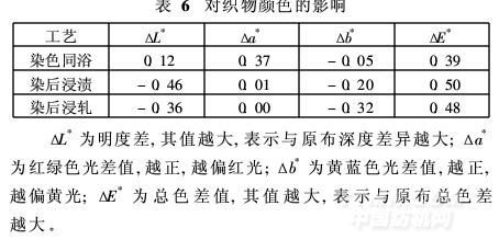 無論采用染色同浴、染后浸漬還是染后浸軋,吸濕排汗劑TF-620對織物顏色的影響都比較小(表6)。