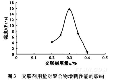 由圖3知,當(dāng)交聯(lián)劑加入量小于0.2%,增稠劑粘度較低,隨交聯(lián)劑加入量的增加,聚合物的增稠能力提高,當(dāng)交聯(lián)劑用量為0.3%時(shí),增稠劑粘度達(dá)到最高,繼續(xù)增加交聯(lián)劑用量,增稠劑粘 度急劇下降。這是因?yàn)榫€型聚合物引入交聯(lián)劑后,形成的網(wǎng)狀結(jié)構(gòu)增強(qiáng)了對(duì)自由態(tài)水的限制,增稠能力也隨之增加。但過(guò)多 加入交聯(lián)劑使得交聯(lián)密度過(guò)大,聚合物的分子量過(guò)高,反而降低 了聚合物的水溶性,導(dǎo)致聚合物增稠能力下降。當(dāng)交聯(lián)劑的用 量達(dá)0.4%后,由于反應(yīng)劇烈易產(chǎn)生暴聚,所得產(chǎn)物幾乎無(wú)增稠能力。交聯(lián)劑加入過(guò)多也會(huì)影響聚合物的抗?jié)B化性能,研究表 明最佳的交聯(lián)劑用量占共混單體質(zhì)量的0.3%。