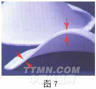具有三維立體結構的經編間隔織物有一定的壓縮彈性,且織物之間有充足的空隙,具有良好的導濕、透氣、溫度調節性能,耐洗性能和模壓成形性,是制作文胸罩杯的理想材料。間隔織物可直接模壓成文胸的罩杯狀,為穿者提供良好的生理支撐,保證胸部的外形挺括、優美,同時還具有良好的穿著舒適性。因此,無論從生產還是服用角度來看,此類織物用作文胸罩杯材料,具有傳統的海綿襯墊不可比擬的優越性。間隔織物用作罩杯材料如圖7所示。