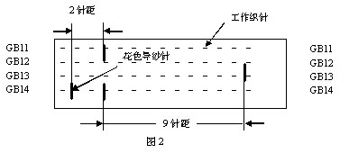 在描繪墊紗運動時,有許多需要加以考慮。首先在編織一個橫列時,裝置在一條集聚橫移線上的各把梳櫛上的導紗針在任何時候都不允許橫移到同一織針針隙處。從理論上講,它們可以進入相鄰的織針針隙中,但花紋鏈塊的磨削必須很精確,否則導紗針可能在擺動通過針隙時相碰,另外梳櫛數(shù)增多后,花梳導紗針變大,這樣,同一條橫移線上不相鄰的兩把花梳的導紗針橫移最小距離為2針距,相鄰兩把花梳的導紗針橫移的最小距離見表1。如圖2所示,在MRESSJ78/1多梳機上GB11和GB13不相鄰的兩把花梳櫛最小距離為2針距,而相鄰的GB13和GB14花梳最小距離為9針距。