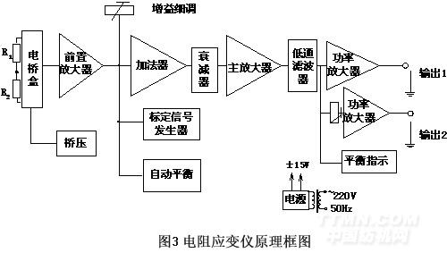 YD-28A型動態(tài)電阻應(yīng)變儀的工作原理框圖如圖3所示,電壓輸出端1與帶USB接口的數(shù)據(jù)采集儀的輸入端相聯(lián)。其主要功能就是對采集的信號進(jìn)行放大、濾波 [3] 。