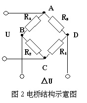 電橋按 120Ω設(shè)計(jì),在電橋盒內(nèi)有兩個(gè)120Ω精密無感線繞電阻作為半橋測量時(shí)的內(nèi)半橋, 外半橋采用兩片等阻值的工作電阻應(yīng)變計(jì) ,結(jié)構(gòu)如圖 2所示。U為供橋電壓;△U為輸出電壓;R 1 和R 2 為測量時(shí)外接應(yīng)變電阻計(jì);R 3 和R 4 為內(nèi)橋電阻。 檢測頭為一受力傳感器,采用一端固定梁式結(jié)構(gòu),梁的正反面中央各貼一片工作電阻應(yīng)變計(jì)。 電阻應(yīng)變計(jì)由極細(xì)的金屬電阻絲用粘貼劑牢固地貼在試件上,或用金屬箔片印刷在試件上 [3] 。