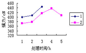 | 圖9 蛋白酶處理時間對強力的影響 | 圖10 蛋白酶 處理時間對堿溶的影響 |