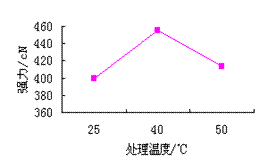 | 圖7 殼聚糖處理溫度對強力的影響 | 圖8 殼聚糖處理溫度對氈縮的影響 |