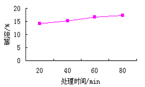 | 圖1 殼聚糖處理時間對K/S值的影響 | 圖2 殼聚糖處理時間對堿溶的影響 |