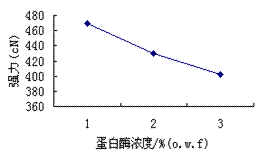 | 圖12 蛋白酶處理濃度對羊毛強力的影響 | 圖13 蛋白酶處理濃度對羊毛氈縮的影響 |