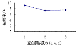 由圖12可看出,羊毛紗線的強力隨著蛋白酶處理濃度的提高而逐漸下降,這說明了蛋白酶對纖維表面鱗片層的破壞作用隨著濃度的增加而增強,因此處理的濃度不宜過強;由圖13可看出,羊毛織物的氈縮率隨著處理濃度的提高而下降,說明處理濃度的提高也增加了蛋白酶的防氈縮效果,在2%(o.w.f)以后,防氈