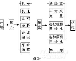 以上述理論為基礎(chǔ)進(jìn)行了編程,程序運(yùn)行在windows98下,采用了VB5.0這種高效、簡(jiǎn)單的編程語(yǔ)言,程序框圖如圖2所示。因計(jì)算機(jī)輔助經(jīng)編工藝計(jì)算是經(jīng)編織物CAD系統(tǒng)的一個(gè)程序,關(guān)于經(jīng)編組織以及穿經(jīng)循壞的數(shù)學(xué)模型等由于篇幅有限,這里不再描述。