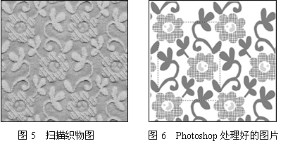 用不同的顏色填充各個效應(yīng)層次,各個層次之間輪廓清晰。目前使用較多的Photoshop6.0圖像處理軟件。處理完的圖片如圖6所示,在圖6中截取一個花紋循環(huán)作為工作花型(圖7所示)。