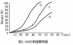 海島型超細纖維是在制成織物后把海組分溶解掉,留下島組分而形成連續不斷的超細纖維織物的。因此海組分的溶解性能對經編麂皮絨的效果至關重要。水溶性聚酯(COPET)在水中的溶解符合先溶脹后溶解的規律。水溶性聚酯(COPET)的組成、結構、分子量及外部條件均對溶解有一定的影響,外部條件對水溶性聚酯(COPET)的溶解的影響如圖2所示。曲線1為水溶性聚酯在95℃的熱水中的溶解。它先以溶解為主;曲線2為水溶性聚酯在95℃下,0.5%NaOH水溶液中的溶解情況,它也有一個溶脹溶解過程,但溶脹較慢,溶解最后還有殘留物,這可能是由于Na+、OH―離子的存在,破壞了高聚物的溶解平衡,使溶解速度變得較慢,另外NaOH也與聚合物中的一些成分產生了反應,生成了沉淀,曲線3為水溶性聚酯在95℃下含0.5% NaOH,1g/L 1227促進劑水溶液中的溶解情況,由于在水中加入了1227表面活性劑,因而,水溶性聚酯在溶脹的同時表面也發生了水解,變成小分子而促進了水解的進行,使溶解速度加快。并且可根據不同情況調整NaOH的百分含量來控制溶解速度。