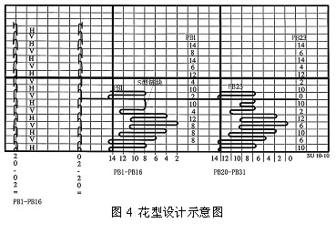 4. 壓紗梳墊紗圖的描繪 為了設(shè)計(jì)方便,我們把壓紗花梳簡(jiǎn)化成襯緯的形式來(lái)描繪。為了在方格紙上更容易設(shè)計(jì)和閱讀鏈塊號(hào),一般按織針進(jìn)行編號(hào),在機(jī)器上這個(gè)點(diǎn)由針間向左移半個(gè)針距。數(shù)字顯示在點(diǎn)下面,后面襯緯花梳還是照原來(lái)的針間編號(hào)閱讀墊紗數(shù)碼。