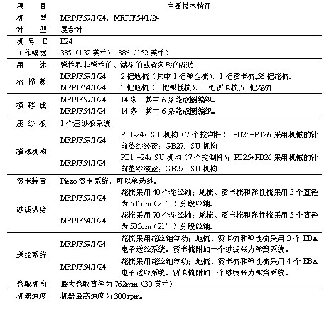 MRPJF59/1/24是一種新型的特克斯簇尼克(Textronic)多梳經編機。為了適應市場變換的要求,該機器在MRESF53/1/24的基礎上作了改進,賈卡由原來的電磁式改成現在普遍使用的匹艾州(Piezo)系統,增加了六把梳櫛,使生產的花邊更完美。后面增加的六把花梳可以換一把滿穿的地梳,即成為MRPJF54/1/24。在壓紗板的后面有兩把地梳,在生產花邊和外衣面料時,彈性的非彈性的都可以生產。該機主要技術特征如表1所示。