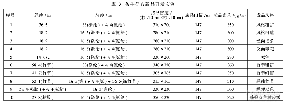 用粘膠紗。減少織造車間的飛花,是保證仿牛仔布成品漂白色質(zhì)量的基礎(chǔ)。在加工過程中,雙氧水和泡化堿(水玻璃)濃度適當(dāng),對漂白色彈力仿牛仔布的影響不大。雙色彈力仿牛仔布,對經(jīng)紗條干均勻度要求很高。接頭過多或條干不勻,都會嚴(yán)重影響布面質(zhì)量。在織物經(jīng)向嵌條或反面印花,都是增加花色品種的有效途徑。綜合以上因素,表2中的多個產(chǎn)品可拓展出更多