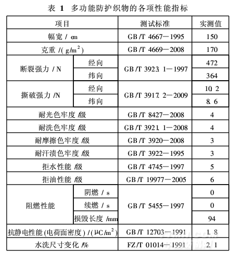 采用上述工藝生產的抗靜電/阻燃/拒水拒油多功能防護織物的各項性能指標見表1。