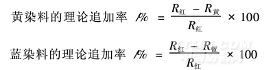活性染料染色時,造成染料追加率不同的因素有:長車連續軋染所用活性染料的直接性和反應性,染料濃度及堿劑用量,以及軋槽染液交換速度。體積小的軋槽,染液的交換速度快,追加率應調小;反之,軋槽體積大,染液更新速度慢,追加率應相應調大。另外,織物帶液量亦會影響追加率。在設定軋余率下,粗厚織物帶液量高,軋槽內染液更新速度快,追加率應調小;反之,稀薄織物帶液量少,軋槽內染液更新速度慢,追加率相應調大。同時,車速快,則軋槽內染液更新速度快,追加率就應調小;反之,則相應調大。在染色初期,拼色染料中的各染料由于直接性不同,導致其上染率也不同,小樣與大車下機差距較大,這是320軋染產品不符樣的主要原因。又由于320打底機軋槽體積是180打底機的1. 5~2倍,因此,活性染料的追加率是分析研究符樣率的重點。T/C產品采用分散/活性染色工藝時,若試樣符樣率在4級以上,定此工藝為分散/活性的軋槽用料工藝;然后,根據計算出的軋余率,調整高位槽開車工藝。開車的工藝即是追加率的制定,一般可根據滲圈來確定染料的追加率。例如活性紅、黃、藍三原色拼色時,將小樣處方染液滴在中速濾紙上,比較滲圈擴散的大小,計算出每只染料在此類處方中的理論追加率。這里選擇比移值為0. 75~0. 8的紅色染料作為基準,以計算理論追加率: