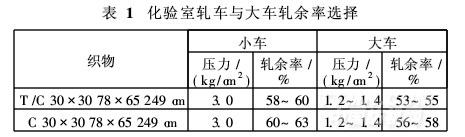 化驗室小樣軋車與大車軋車軋余率的相符性,亦是影響符樣率的關鍵因素。如果兩者軋余率相差較大,會導致染料上染率不同。化驗室小軋車由于車速慢,軋輥線速度低于大車,軋輥對布的作用時間長,相同軋余率下帶液量少,因此小樣的軋余率需提高5% ~10%。根據320寬幅家紡軋染生產線的生產情況,摸索出化驗室小樣與大車相對應的壓力,具體工藝參數見表1。