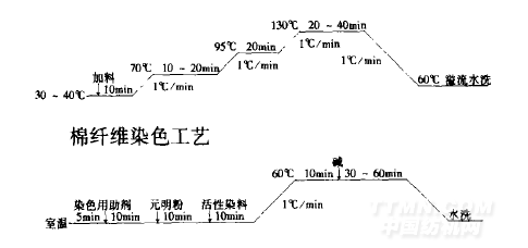 以溢流染色為例,從染色開始時就要采取一定的工藝措施,控制染色全過程,實現(xiàn)均勻吸附,以保證染色的均勻性與重現(xiàn)性。不應(yīng)該依靠高溫條件保溫移染以達到勻染。因此,在低溫始染階段就應(yīng)控制上染速率,以確保染料均勻吸附。