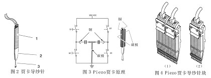 Piezo賈卡元件用于控制經編機上賈卡導紗針的偏移。它由兩片壓電陶瓷組成,它們之間由玻璃纖維層隔離(絕緣)。壓電陶瓷有加上電壓自己會變形的屬性,為了傳遞電壓,采用了具有很好彈性和傳導性的電極。如圖3所示,通過開關S1和S2的切換,在Piezo賈卡元件的兩側交替加上200V電壓。壓電陶瓷變形,使得導紗針向左偏移或者向右偏移。因為壓電陶瓷效果象電容一樣,Piezo賈卡元件能保持在它的偏移位置。為了精確定位,在賈卡導紗針兩側設置定位塊。