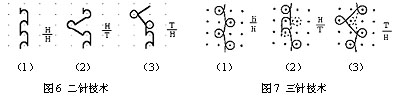 賈卡導紗針在針背橫移時沒有偏移,作1-0/0-1。在二針技術中一般不用。如圖6(1)所示。