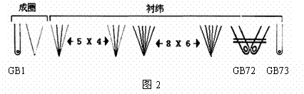 帶壓電賈卡系統(tǒng)的MRPJ73/1多梳機(jī)具有緊密性、可靠性和清潔性等特點(diǎn)。賈卡梳櫛的兩面均具有壓電陶瓷條。當(dāng)受電流脈沖作用時(shí),相應(yīng)的賈卡導(dǎo)紗針從釋放的位置實(shí)現(xiàn)側(cè)向移動(dòng)。這樣不需要任何機(jī)械控制,利用電子脈沖,每一賈卡導(dǎo)紗針都可以被單獨(dú)選針。壓電賈卡梳櫛位于地梳櫛和花梳櫛之后,處于倒數(shù)第二的位置上。在織物表面使用襯緯紗線和勾邊紗線可以得到清晰的三維立體花紋。這種機(jī)型總共有73把梳櫛,如圖2所示,其中位置1是1把地梳櫛,70把花梳櫛(GB2~GB71),位置72上是一把單獨(dú)的壓電賈卡梳櫛,位置73上是一把彈性紗梳櫛。這些梳櫛被分為18個(gè)橫移組,其中2個(gè)橫移組可以形成線圈。梳櫛的橫移是由2個(gè)帶有微處理器的數(shù)字式起花裝置控制的,它位于機(jī)器的左右兩側(cè)。其中位于機(jī)器右邊的微處理器控制地梳櫛,壓電賈卡梳櫛和所有從GB4開(kāi)始的偶數(shù)號(hào)提花梳櫛;而位于機(jī)器左邊的微處理器則控制從GB5開(kāi)始的奇數(shù)號(hào)提花梳櫛??刂剖釞盙B2和GB3的機(jī)械墊紗機(jī)構(gòu)位于機(jī)器的左側(cè)。由—個(gè)單針插入式的復(fù)合針床、一個(gè)針芯床、一個(gè)移動(dòng)式的握持沉降片床和一個(gè)柵狀脫圈板所組成的成圈機(jī)件由浸于一封閉油浴中的偏心盤式的曲柄傳動(dòng)機(jī)構(gòu)連續(xù)傳動(dòng)。紗線置于5×533mm(21″)的分立式經(jīng)軸架上和放置70根花經(jīng)軸的花經(jīng)軸架上。喂紗裝置由控制地梳櫛、壓電賈卡梳櫛(GB72)和彈性梳櫛(GB73)的3個(gè)EBA電子送經(jīng)裝置組成。為了保證更長(zhǎng)的運(yùn)行時(shí)間,使用2根經(jīng)軸共同為壓電賈梳櫛送經(jīng)。壓電賈卡梳櫛的紗線由分段經(jīng)軸通過(guò)張力彈簧系統(tǒng)(平衡彈簧)控制送紗。