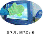 超細纖維清潔用織物 對去除指紋、手垢、淀粉類和其它水溶性物質等污物有較好的效果。 包括高效清潔巾、清潔手套、手機擦巾等。該織物去污能力特別強、手感非常柔軟、多次水洗不會變硬、不抽絲、不脫圈,耐用性為普通清潔物的 4 倍以上。主要用于擦拭轎車、飛機、眼鏡、顯示器(如圖 3 )、精密儀器、玻璃、水晶制品、皮革制品、高檔服裝、家電、家具等。去污塵不留痕跡,保護漆面、電鍍、玻璃面、鏡頭。使用后即可用水沖洗,毛巾上的污漬極易去除,油污嚴重時,只用少許香皂或洗衣粉就洗得一干二凈。