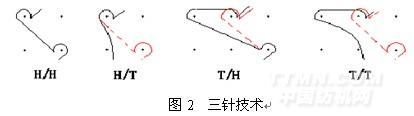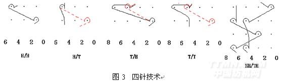 三針技術(shù)滿機(jī)號(圖 2 )和四針技術(shù)滿機(jī)號(圖 3 )是 RJPC 4F 經(jīng)編機(jī)壓紗賈卡技術(shù)中最基本的技術(shù),這兩種技術(shù)通過賈卡導(dǎo)紗針的偏移形成不同針距的墊紗,然后通過織針之間的偏移或不偏移進(jìn)行結(jié)合,形成厚薄不一,并且具有明顯層次效應(yīng)的織物。