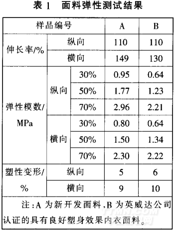 成品定形時間約53 s,該定形工藝比較成熟。因為從染色后的結(jié)果來看,布面比較平整,手感、彈性均佳,無須再做特別的改進(jìn) 實際 開發(fā)中,可根據(jù)布面的現(xiàn)場效果做適當(dāng)調(diào)整 但是溫度盡量不宜過高,150℃已頻臨聚酯類氨綸的黏流態(tài),在高溫有張力并且有硅油的情況下,氨滌與錦綸的有效粘連會 遭破壞,布面彈性降低