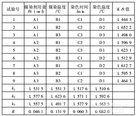 注:染料用量5%(owf),媒染時(shí)間30min,浴比1∶30。A2B2C3D2。考慮到染色45min和60min時(shí)K/S值非常接近,為節(jié)約能源,確定染色時(shí)間為45min。