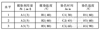 綜合以上單因素試驗(yàn),選取媒染劑用量、媒染溫度、染色時(shí)間和染色溫度四個(gè)因素進(jìn)行正交試驗(yàn)。因素水平設(shè)計(jì)和染色試驗(yàn)結(jié)果見(jiàn)表3和表4。