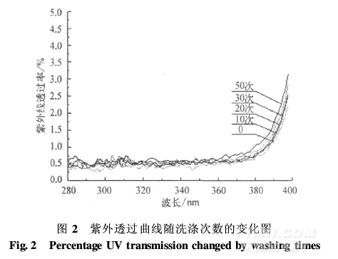 為確切地了解織物抗紫外功能的耐洗性,按標準[8](用含2 g /L洗衣粉洗滌,浴比1∶30,水溫40℃,洗滌時間5 min,然后蒸餾水漂洗干凈)對整理后的織物分別進行10,20,30次的洗滌,與洗滌及洗滌50次的織物作紫外透過曲線對比圖,如圖2所示.由圖2可以看出,透過率隨洗滌次數增加有上升的趨勢,但上升幅度并不大,50次洗滌后整個UVA和UVB波段的透過率仍都在3%以下,進一步證明了該工藝下的無機紫外屏蔽整理具有較好的耐水洗性.