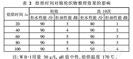 由表2可知,延長焙烘時間,含氟整理劑WR-1在錦綸織物上的交聯程度逐漸提高,織物的拒水、拒油及耐洗效果提高。焙烘60 s后,繼續增加焙烘時間對拒水拒油及耐洗效果影響不大,且長時間焙烘會使織物產生黃變,因此確定焙烘時間為60 s。