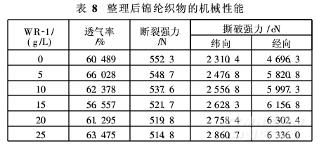 按優化工藝,以不同用量整理劑WR-1整理錦綸,整理織物的各項性能見表8。