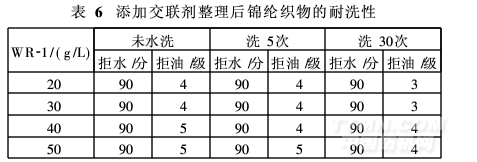 (4)對于耐洗性要求較高的拒水拒油產品,整理工作液中可添加適量的交聯劑(用量為WR-1的15% )。