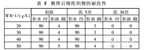 將經不同用量整理劑WR-1整理后的織物按1. 4節(6)進行耐洗性試驗,結果見表5。