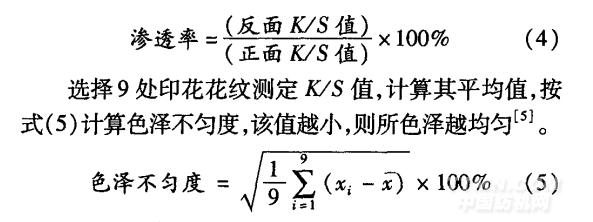 分別用活性紅RES、活性黃3RS和活性翠藍RES在平紋棉織物上印花,用UltraScan XE型分光測色儀 測定織物花紋處的K/S值。由正反面的K/S值按式