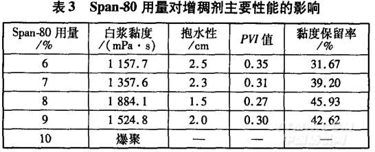 從表3可知,隨著乳化劑用量的增加,體系中膠束 總濃度增加,聚合物相對分子質量增加,故增稠效果提 高;繼續增加乳化劑用量,白漿黏度下降,甚至出現爆 聚現象。從抱水性、流變性和耐鹽性來說,Span一80用 量為單體總用量8%時的效果較好。
