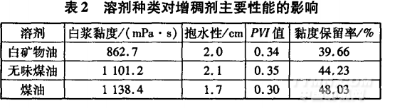 由表2可知,相對于煤油和無味煤油,白礦物油作 為溶劑制得的增稠劑的增稠效果差,而由煤油制得的 增稠劑的增稠效果比無味煤油好;從抱水性來說,用煤 油作溶劑優于無味煤油和白礦物油;從流變性來說,用 煤油作溶劑時PVI值小,流變性優于用白礦物油和無 味煤油做溶劑;從耐鹽性來說,用煤油作溶劑時黏度保 留率低,耐鹽性比用無味煤油和白礦物油好。所以,宜 用煤油作溶劑來制備增稠劑。