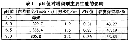 改變pH值(5.5,6.0,6.5,7.0),按1.3節方法合成增稠劑。將增稠劑配成1%的白漿,測試其主要性能,結果如表l所示。