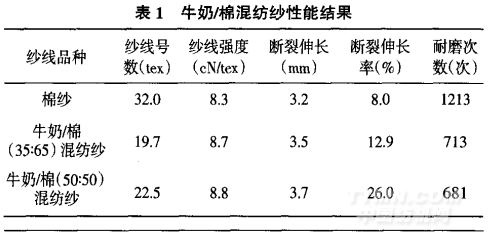 本實驗使用的棉紗、牛奶/棉混紡紗均來自上海正家牛奶絲科技有限公司,其中含有牛奶蛋白纖維和長絨 棉的比列為35:65和50:50。紗線性能測試使用YG026A 電子強力機,選用200mm夾持距離,45ram/rain的拉伸速 度,預加張力15g,共測試100組數據,取平均值。耐磨儀 采用LFY一109A多功能紗線耐磨性能測試儀,測試試樣 數20根,取平均耐磨次數。各項性能如下表1所示。