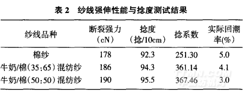 從表2可以看出,牛奶/棉混紡紗的斷裂強力隨著牛奶纖維含量的增加而變大,主要原因是牛奶纖維的斷裂強力高于棉紗;從捻度和捻系數測試結果可以看出差別不大。