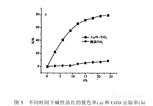 (5)用所制備的Co/N-TiO2作為光催化劑,在可見光的照射下光催化降解堿性品紅6 h后,堿性品紅可完全脫色,24 h后COD去除率可達79.4 %。