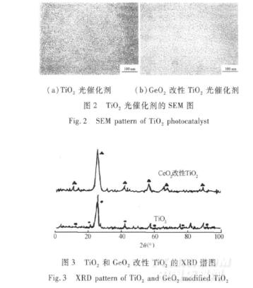 圖2 是TiO2和GeO2改性TiO2的光催化劑的電鏡掃描照片。由圖2 可見,經(jīng)GeO2改性的TiO2光催化劑的粒徑較TiO2的粒徑明顯變小,分布更為均勻,比表面積會增大,催化劑中有更多的活性較高的微晶粒存在。添加GeO2后可改變催化劑的化學組成、電子結構、表面性質和晶體結構,可明顯地增強銳鈦礦復合氧化物催化劑的分散特性和吸附性能[10],使GeO2改性的TiO2光催化劑具有更高的光催化活性。