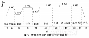 圖3是絲光機的運轉(zhuǎn)工藝曲 線。 一個絲光程序總用時約為6 min(包括上下紗)。技術(shù)參數(shù)如下: 液堿濃度:260 g/I : 液堿溫度:(23±2)cc.需配備 足夠制冷量的液相交換冷凍機以 保證整個生產(chǎn)過程堿液溫度穩(wěn)定: 液堿滲透性:≤5 s(工業(yè)帆布 在堿液中的沉降時間).這項指標對確保絲光紗的絲光鋇值均勻一致非常重要: