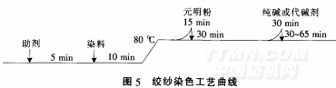 絞紗染色的前處理工藝無其他特殊要求.只是經絲光后濕態絞紗含較多堿液(NaOH濃度約為20~40 g/L).故前處理處方中基本不需加堿即可進行練漂加工 絞紗染色工藝曲線如圖5所示。染料選擇:因色織針織布還需進行坯布絲光加工.故通常會選用雙一氯均三嗪結構.即耐堿性較優秀的高溫型活性染料染色.如德司達H—E型、科萊恩X型和國產品牌KE型等。