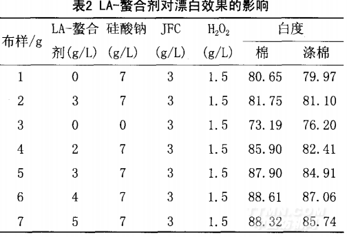 表2中布樣1采用的是傳統的漂白方法,漂浴中沒有加入LA一螯合劑,布樣2的漂浴是在布樣l漂浴的基礎上加入了LA一螯合劑,比較兩種布樣所得的白度可以看出,加入了LA一螯合劑對純棉織物的白度有一定程度提高。從表中的對比實驗還可以看出,在沒有加入硅酸鈉的漂白浴中,如沒有加入LA一螯合劑(布樣3),織物的白度比較低,加入LA一螯合劑后,織物的白度有了明顯的提高,而且隨著LA一螯合劑濃度的增加,織物的白度也提高。當濃度為4g/L時,織物的白度達到了最大值,如濃度繼續增加,織物的白度開始降低。