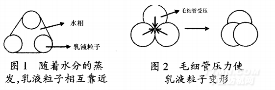 互相接近的乳液粒子之間產生毛細管現象,出現毛細管壓強,促使毛細管變細;毛細管越細,壓強越大,當毛細管壓強大于乳液粒子的抗變型力的時候,乳液粒子就發生變形,如圖2。